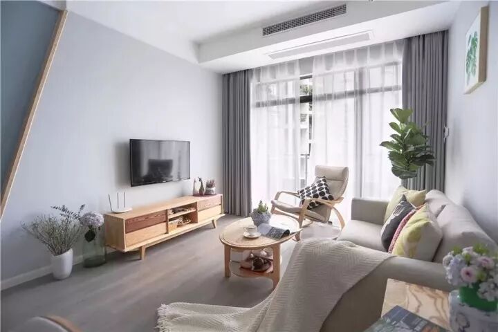 这个客厅设计的很有意思,电视墙是蓝灰及暖灰色组成,中间是实木线条收边,简单的设计,却呈现不简单的效果,个人非常喜欢这种感觉,那么窗帘,则选得是比墙面色更深的灰色,从而让整体看起来更有层次感;